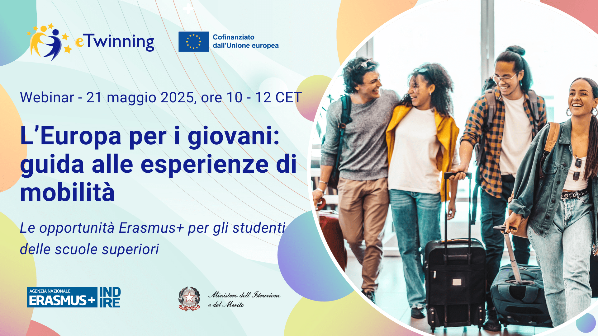 Mercoledì 21 maggio dalle ore 10 alle 12, l’Unità nazionale eTwinning INDIRE organizza un evento formativo online rivolto a tutti gli studenti delle scuole secondarie di II grado per scoprire le opportunità di mobilità offerte dall’Unione Europea nel campo della scuola, dell’università, della formazione professionale e dei percorsi giovanili.