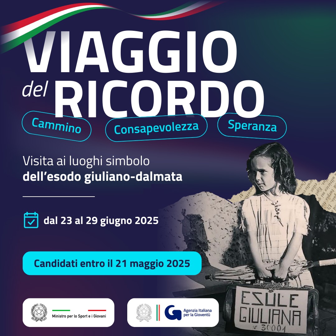 Il Ministro per lo Sport e i Giovani in collaborazione con l’Agenzia Italiana per la Gioventù, in occasione degli eventi organizzati nell’ambito della Giornata del Ricordo, solennità civile nazionale italiana celebrata il 10 febbraio di ogni anno, promuove il Viaggio del Ricordo, con l’obiettivo di far conoscere ai giovani i luoghi simbolo dell’esodo giuliano-dalmata, per ricordare gli eventi, per conservare e rinnovare la memoria, affinché le tragedie del passato non si ripetano in futuro.