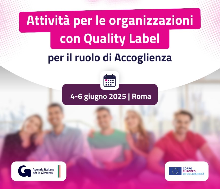 Nell’ambito del Ciclo di formazione e valutazione (TEC – Training and Evaluation Cycle) del programma Corpo Europeo di Solidarietà (ESC- European Solidarity Corps), l’Agenzia Italiana per la Gioventù organizza a Roma, dal 4 al 6 giugno 2025, un’attività per le organizzazioni titolari del Marchio di Qualità (QL – Quality Label).