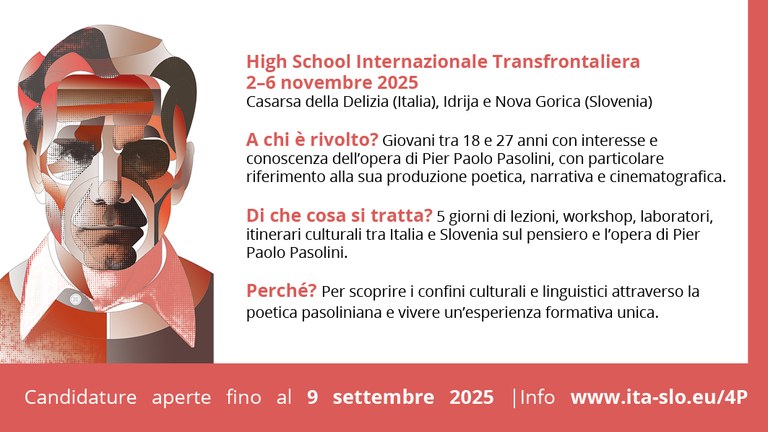 Nell'ambito del progetto europeo "4P - Percorsi transfrontalieri scoprendo Pier Paolo Pasolini" di cui il Comune di Pordenone è capofila, è aperto il bando per la selezione di partecipanti alla "Pasolini High School", che si terrà dal 2 al 6 novembre a Casarsa della Delizia (PN), Idrija e Nova Gorica (Slovenia).